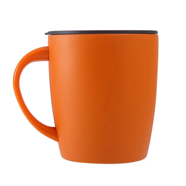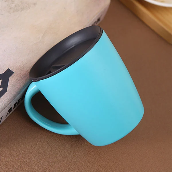Dette er en trend-udseende kaffekrus i rustfrit stål med låg, afrundet udseende, lad dig holde et godt humør, placeret på bordet, er også et kunstværk.