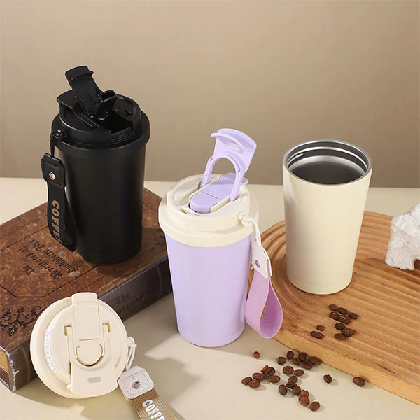 Denne 360 ml vakuumisoleret kaffeflaske i rustfrit stål har et super praktisk låg, dette låg frigør ikke kun dine hænder, men giver dig også mulighed for at drikke vand på forskellige måder. En måde er åbent kortet og direkte for at drikke, og en anden måde er åben halm, drik med halm. Begge måde kan fungere med en hånd. Uanset om du kører, arbejder eller bruger din telefon til at se Tiktok, kan du alle drikke vand samtidigt.